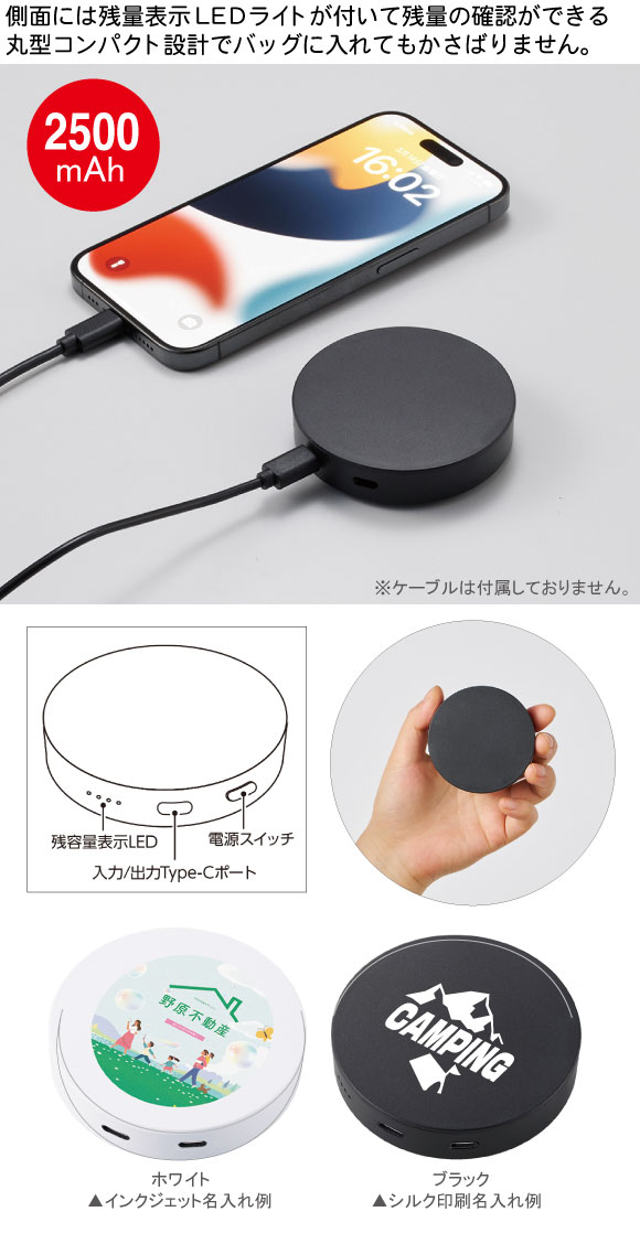 スマートモバイルチャージャー2500 ラウンドはデイリー使いにぴったりなコンパクトモバイルバッテリーとしてお求めやすい価格で登場しました!2500mAhのめずらしい容量サイズと、ころんとした円形フォルムがポイントです。側面には残量表示LEDライトがついており、簡単に残量の確認ができる仕様です。また入出力ともにType-C仕様を採用しています。リーズナブルな価格帯なので、展示会や説明会のノベルティからエンタメ案件などにも幅広くご提案いただけます。