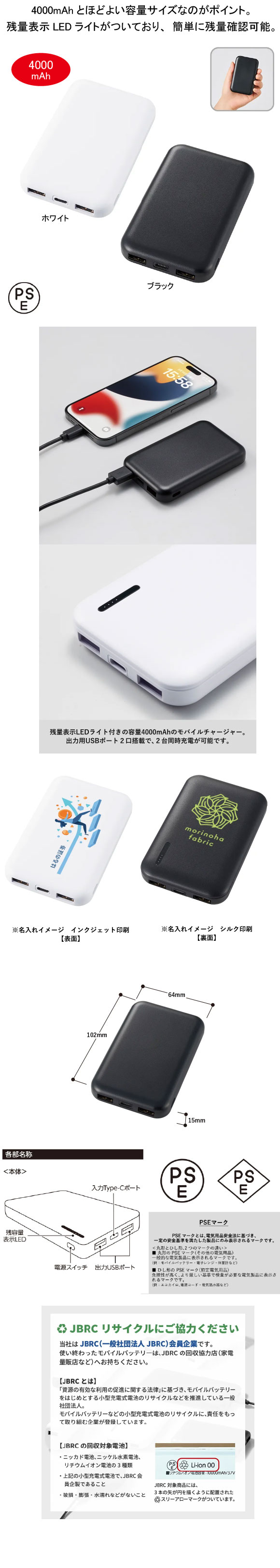スマートモバイルチャージャー4000 2月末までの特別価格はデイリー使いにぴったりなモバイルチャージャーがお求めやすい価格で登場しました!4000mAhとほどよい容量サイズなのがポイント。側面には残量表示LEDライトがついており、簡単に残量の確認ができる仕様です。また出力用USBポートは2口搭載されているため、2台同時充電も可能です。