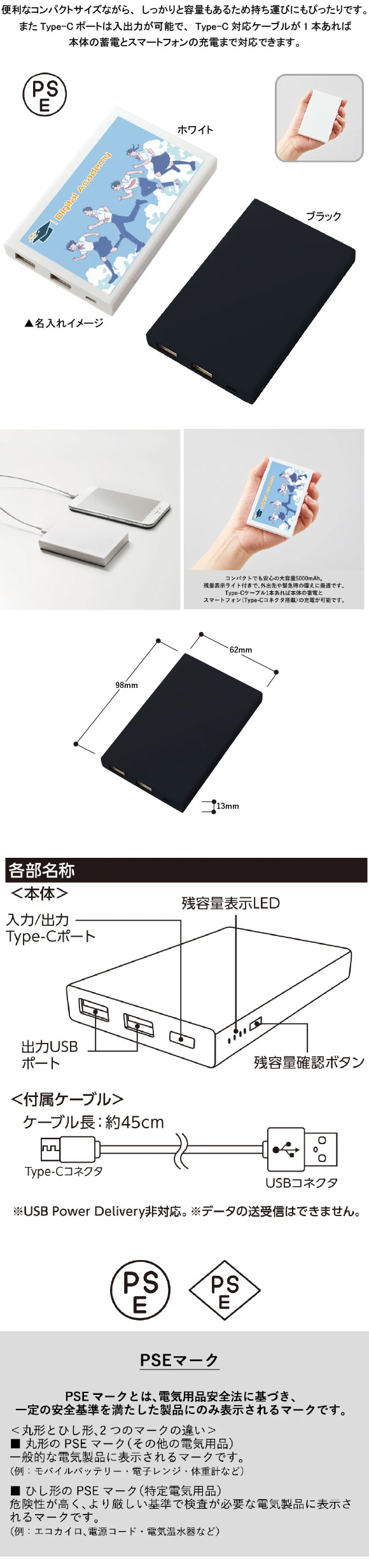 モバイルチャージャー5000 Type-C対応 ver.2は1台あると便利なモバイルチャージャーです。便利なコンパクトサイズながら、しっかりと容量もあるため持ち運びにもぴったりです。またType-Cポートは入出力が可能で、Type-C対応ケーブルが1本あれば本体の蓄電とスマートフォンの充電まで対応できます。カラーは幅広くご提案しやすいシンプルなブラック、ホワイトの2色展開です。両面に単色印刷またはフルカラー印刷が可能なため、成約特典や企業の記念グッズ、エンタメ物販としてもおすすめです。