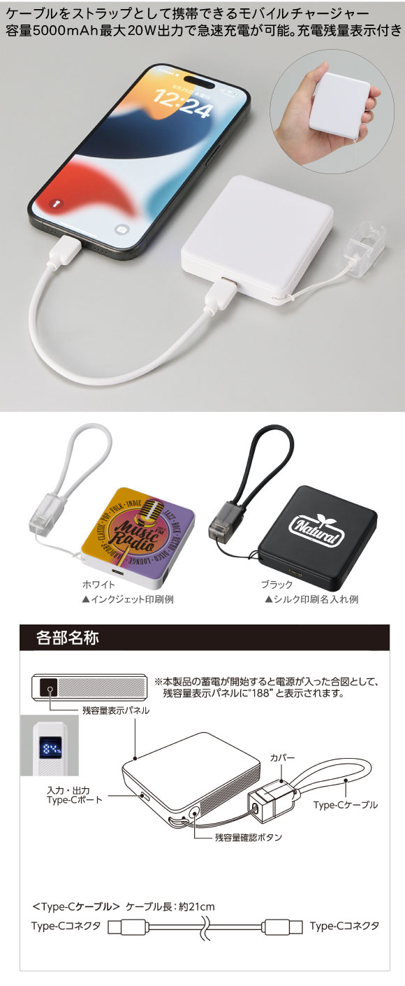 PD急速充電コードストラップ付モバイルチャージャー5000は全面印刷対応!ケーブルをストラップとして携帯できるモバイルチャージャーです。容量5000mAhかつ、最大20W出力で急速充電が可能なうえ、本体はコンパクトなサイズで、持ち運びに便利です。また充電残量がわかる残量表示パネル付きです。付属のtype-Cコードストラップは、本体の蓄電とスマートフォンの充電がどちらも可能です。本体表裏に単色印刷または、全面フルカラー印刷が可能でキャラクターやアーティスト、ロゴなどを大きくプリントすることが可能です。