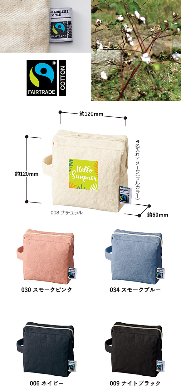 フェアトレードコットンキャンバスファスナーポーチ(S)はフェアトレードコットンを使用したキャンバスポーチです。スクエアタイプのポーチで、アクセントとしてハンドルが付いているのが特徴です。Sサイズは正方形型で、リップやイヤホン等の小物を入れることができ、普段使いにもオススメのサイズ感です。国際フェアトレード認証ラベル付きのアイテムとなっており、SDGsやサスティナブルへの取り組みで企業価値を高められます。ナチュラル以外のカラータイプは、染色工場もフェアトレード認定工場で生産されており、染料は第三者認証を受けた製造工場で生産しているものを使用しております。