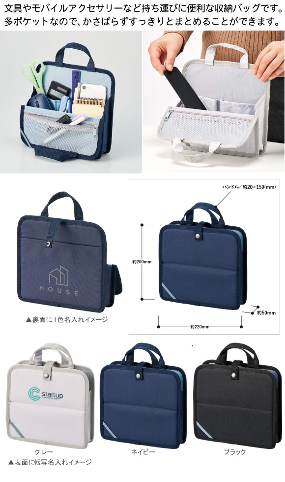 文具まとめて持ち運びバッグは文具やモバイルアクセサリーをひとまとめにできる持ち運びに便利な収納バッグです。内側は明るい色にしているため中まで見やすく、また片面を倒して左端のゴムで留めることでも中身を確認しやすくなります。多ポケットなので、かさばるアイテムをすっきりとまとめることができます。スリムマチ設計で持ち運びに便利なのはもちろん、底板は取り外し可能でバッグインバッグとしてもぴったりです。口元オープンタイプのなので背の高いアイテムも入れることができるのもポイントです。ノベルティや記念品、物販品などとしてご提案でき、フリーアドレス制のオフィスなどでお使いいただけます。
