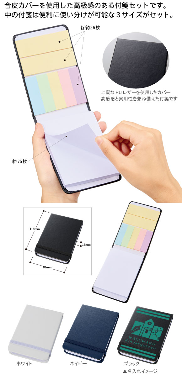 合皮カバー付箋セット(M)は合皮カバーを使用した高級感のある付箋セットです。用途にあわせてお選びいただけます。カバーは落ち着いたカラー展開で、説明会や展示会ノベルティ、企業グッズほか学校で使用する記念品などにもご提案いただけます。また、中の付箋は便利に使い分けが可能な3サイズがセットになっています。(付箋:大/約75枚 中/約25枚 小/各25枚) 表紙、裏表紙ともに名入れができ、シルク単色印刷からフルカラー印刷、素押し・箔押し(別途見積り)まで幅広く対応可能です。