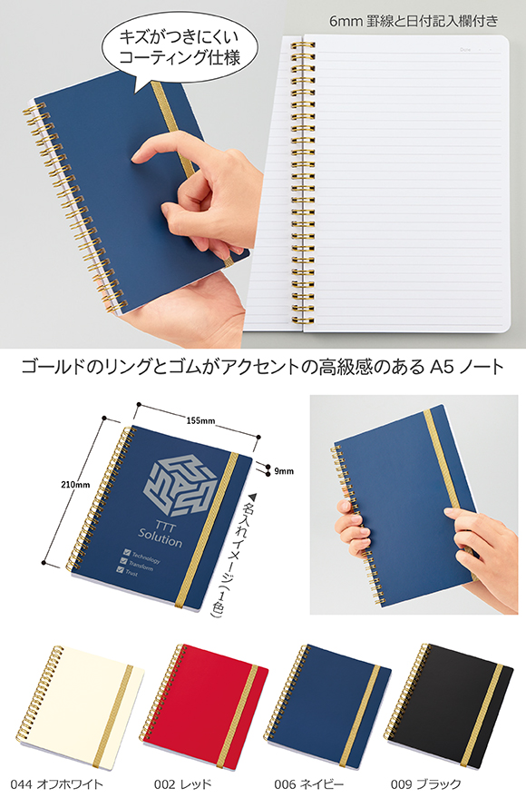 ゴールドリングA5ノートはゴールドのリングとゴムがアクセントの高級感のあるハンディノートです。表紙・裏表紙は白厚紙を使用しており、手触りの良いマットコーティングで、傷がつきにくいのが魅力です。また中紙は6mm罫線で日付入れるスペースもあり、ビジネスシーンでも活躍する仕様です。