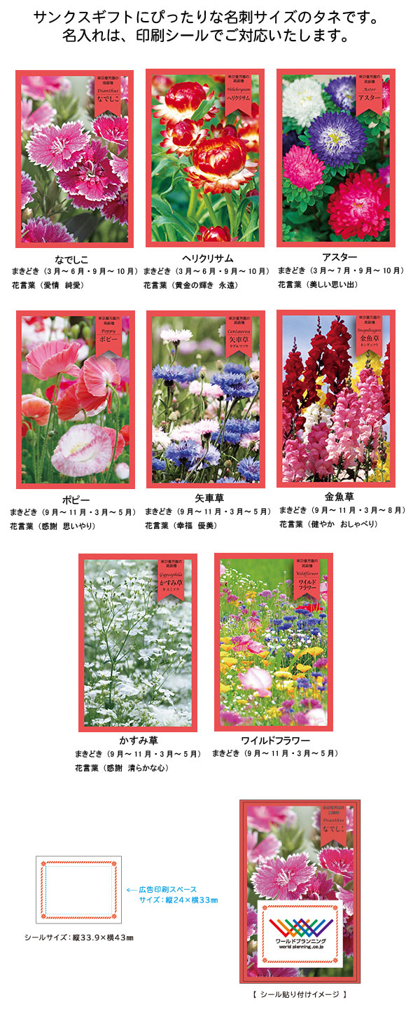 Thank You Seed(名刺型) 花の種はサンクスギフトにぴったりな名刺サイズのタネです。「感謝」のタネをまいて、大切な人との絆の花を咲かせよう。Thank You Seedはサイズがとってもコンパクト。薄くてかさばらないので、通販購入のお礼やカタログ送付の際に同封する粗品にぴったり。Thank You Seedは紙製パッケージ。 サステナブルノベルティを活用することで、SDGs活動の取り組みをアピールすることができ、事業のイメージ向上にもつながります。名入れは、印刷シールでご対応いたします。ご注文は500個以上から1品種につき100個単位となります。