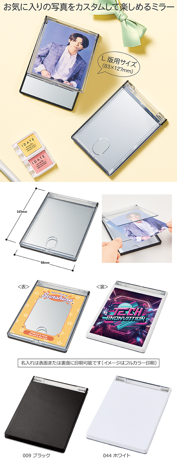 カスタムデザインミラー(L版用)はお気に入りの写真をカスタムして楽しめるミラーです。フタ部分にL版写真をセットすることで、オリジナルミラーが完成します。また差し替えが可能なので、お好きなタイミングでお気に入りの写真に変えられるのもうれしいポイントです。本体の表裏に名入れが可能で、表側にフレームのようなデザインを入れれば中の写真をより華やかに見せてくれます。また、裏面にも広い範囲に印刷が可能なのでロゴやキャラクターデザインを入れてもよりオリジナリティの高いアイテムを作成できます。