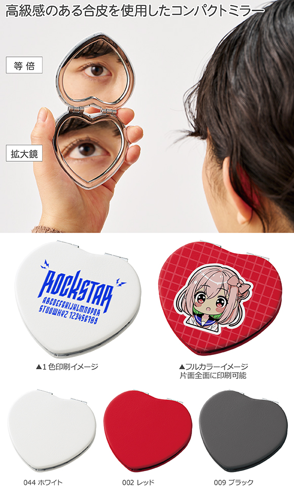 全面印刷できる合皮コンパクトミラー ハートは高級感のある合皮を使用したコンパクトミラーです。鏡部分は片側が等倍鏡、もう一方は拡大鏡になっています。エンタメ案件にもぴったりなハート型ミラーで幅広い案件に対応可能なベーシックなホワイト・ブラック、かわいらしい印象のレッドを加えた3色展開です。表面に単色印刷はもちろん、フルカラー印刷も可能でオリジナル性のあるグッズをおつくりいただけます。コスメ・アパレルブランドのノベルティや、イベント物販などにもおすすめです。