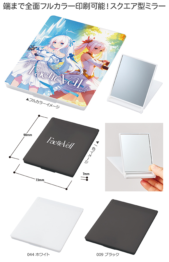全面印刷できるマットスクエアミラー(S)は端まで全面フルカラー印刷可能!シンプルなスクエア型ミラーです。様々な案件に対応しやすいホワイト・ブラックの2色展開です。S・Mの2サイズ展開で、用途に合わせてお好みのサイズをお選びいただけます。Sサイズはコンパクトな小さめサイズ感なので、外出時など持ち歩きにぴったりです。全面フルカラー印刷対応で、キャラクターやアーティスト物販などエンタメ案件におすすめです。