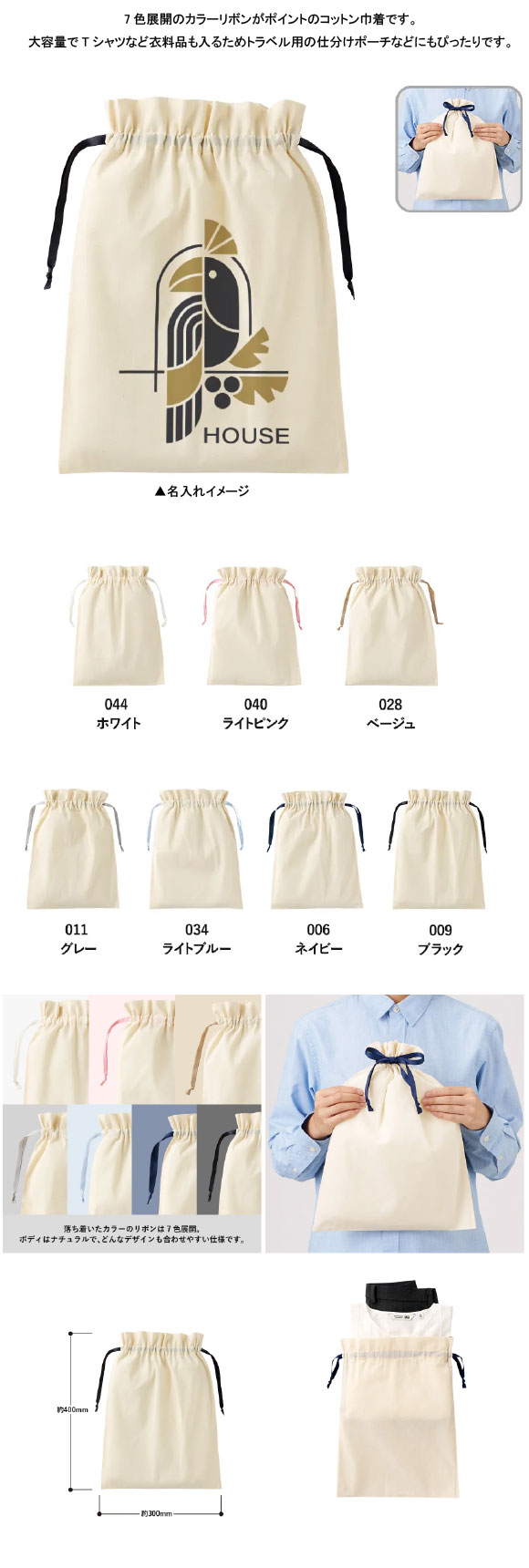 Lサイズは大容量でTシャツなど衣料品も入るためトラベル用の仕分けポーチなどにもぴったりです。またリボン部分は長めに設定しリボン結びができる仕様で、パッケージとしてもご活用いただけます。単色印刷からフルカラー印刷まで対応可能で、化粧品ブランドや食品関係のパッケージからアパレルブランドのノベルティなどにもご提案いただけます。