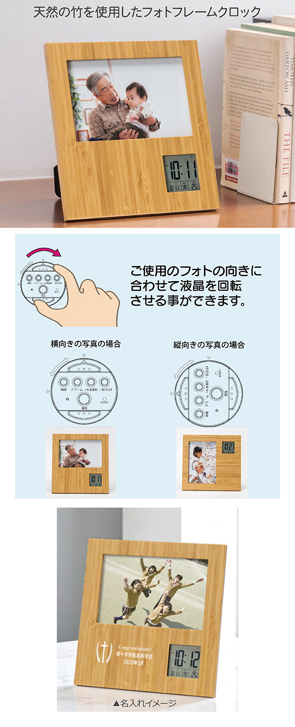 竹のフォトフレームクロックは天然の竹を使用したフレームフォトクロックです。ご使用の写真の向きに合わせて液晶の向きが変えられます。名入れをして記念品におすすめです。