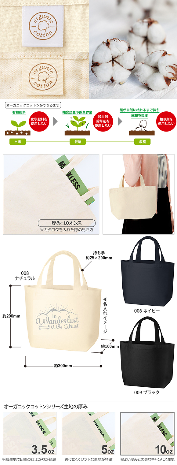 オーガニックコットンキャンバストート(S)は農薬や化学肥料などを3年以上使わず、有機農法で育てられたコットンを使用した地球環境、働く人々にとってもやさしいバッグシリーズです。また、ネイビーとブラックで使用している染料は第三者認証を受けた製造工場で生産しているものを使用しております。Sサイズはちょっとしたおでかけの際にお財布や携帯を入れるのにぴったりなサイズ感となっております。レジャー施設のオリジナル商品や住宅展示場の来場記念品としてご提案頂けます。使い勝手の良い丈夫な定番キャンバス。