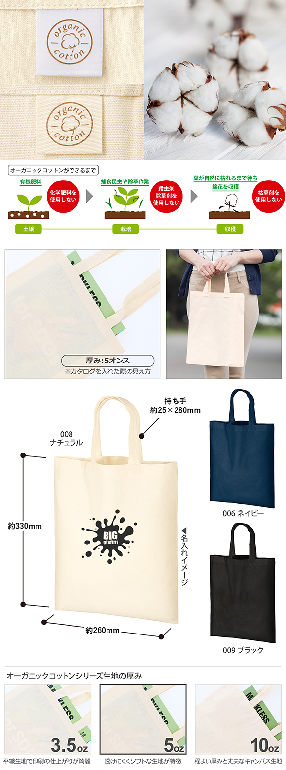 オーガニック厚手コットンA4フラットバッグは農薬や化学肥料などを3年以上使わず、有機農法で育てられたコットンを使用した地球環境、働く人々にとってもやさしいバッグシリーズです。また、ネイビーとブラックで使用している染料は第三者認証を受けた製造工場で生産しているものを使用しております。ノベルティの定番として人気の高いA4サイズがぴったり入るマチなしタイプ。程よい厚みの5oz生地でシーチング素材に比べて透けにくいため、カタログや資料入れにもぴったりです。