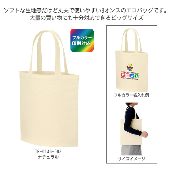 ライトキャンバスフラットバッグ(L) ナチュラル フルカラー名入れ専用は柔らかさと耐久性を兼ね備えた生地厚8オンスのキャンバスバッグシリーズです。A3サイズも入るビッグサイズなので、配る資料の多い展示会バッグやアーティスト物販として幅広い用途にご利用いただけます。肩かけ利用も可能なので、日用使いのトートバッグや、お買い物用のエコバッグとしてもおすすめです。ナチュラルカラーは無漂白のエコマーク認定商品です。熱転写で色鮮やかに!販売促進としてノベルティ、販促品用にロゴやマークなどの名入れをし 配布すれば企業やお店のイメージアップや売り上げにつながります。