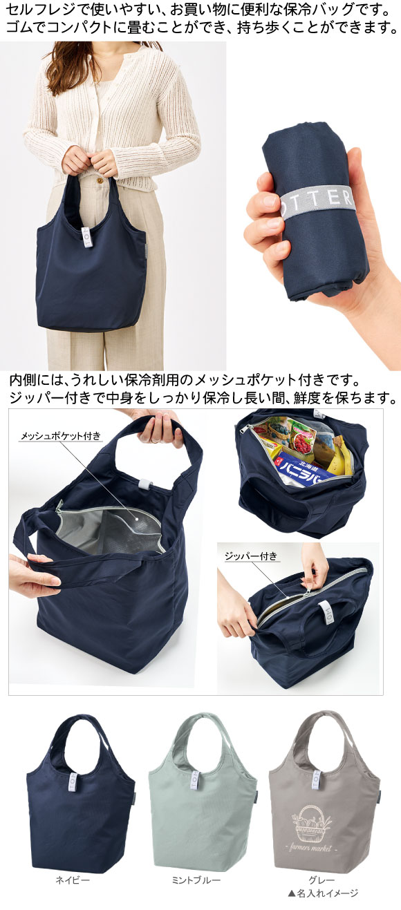 MOTTERU クルリト セルフレジで使いやすいコンパクトクーラーミニマルシェバッグはゴムバンドでくるりとコンパクトにまとめて持ち運びができるエコバッグです。お買いものバッグや荷物が多い時のサブバッグとしてお使い頂けるサイズ感となっております。セルフレジで使いやすい、お買い物に便利な保冷バッグで本体内側には、うれしい保冷剤用のメッシュポケット付きです。さらにセルフレジで使用する際には、持ち手をバーに引っ掛けて使用することができます。底マチ部分には芯材が入っているため、中がしっかりと広がって食品をいれやすくなります。どなたでも使っていただきやすいネイビー、グレー、ミントブルーのカラー展開で食料品店向けのノベルティや記念品などに幅広くご提案していただけます。
