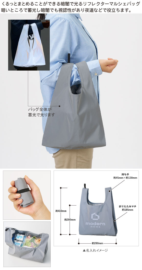 リフレクターマルシェバッグ(M)は暗闇で光るリフレクターマルシェバッグMです。暗いところで蓄光し暗闇でも視認性があるため、夜道などで役立ちます。Mサイズはコンビニでのちょっとしたお買い物に最適なサイズ感です。持ち手の先にゴムがついており、くるっとまとめることができるため持ち歩きにも便利です。本体に単色印刷にて名入れが可能なので、防犯対策を意識したグッズとしてのご提案もおすすめです。