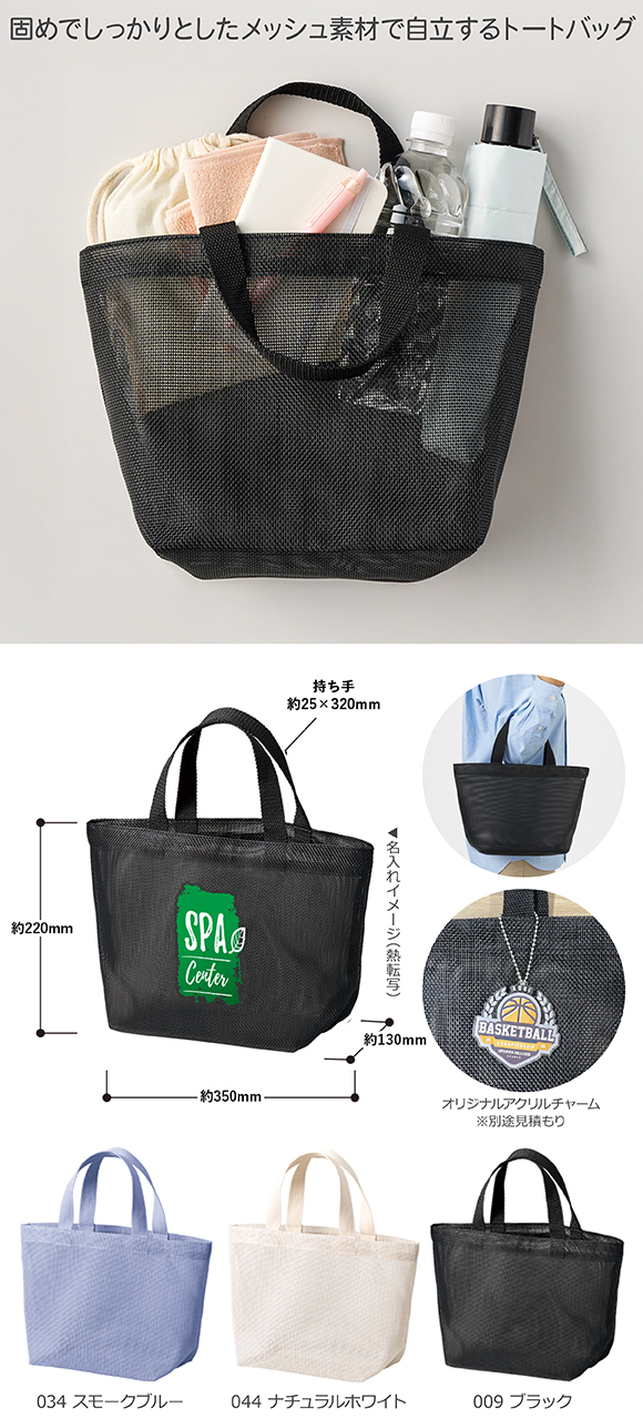ハードメッシュトート(S)は透け感のあるメッシュ素材のトートバッグです。固めでしっかりとしたメッシュ素材で自立するのがポイントです。持ち手部分以外はメッシュ素材なので中身が確認しやすい仕様です。S・Mの2サイズ展開で、Sサイズは折り畳み傘や500mlペットボトルが縦に入るサイズ感です。またメッシュ素材なので、濡れたものも入れやすいためビーチやプール、サウナなどでもお使いいただけます。本体に熱転写印刷が可能なため、ブランドロゴなどを入れてオリジナルグッズをおつくりいただけます。