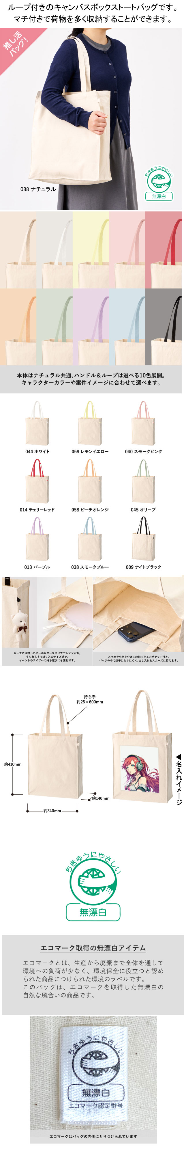 バッグ本体は共通のナチュラルカラーで、ハンドルとループは10色展開のためキャラクターやブランド、企業カラーなど案件に合わせてご提案いただけます。ループにはキーホルダーを付けることができ、推し活の必需品であるうちわを収納できるサイズ感で推し活グッズとしてもぴったりです。また内ポケット付きで、スマホなどちょっとした小物を入れるのに便利です。