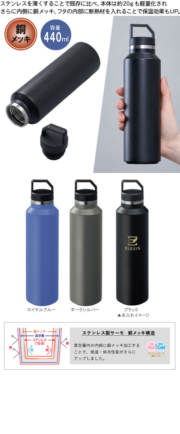Zalattoサーモハンドルスリムボトル 440ml は表面はざらっとしたマット塗装とシックな色合いのサーモハンドルスリムボトル。真空二重構造で保冷保温効果があり一年中ご利用いただけます。スリムなボディにハンドルが付いてアウトドアなど持ち運びに便利な商品です。持ち運びにも便利なスリムボトルです。ステンレスを薄くすることで既存に比べ、本体は約20g軽量化され、さらに内側に銅メッキ、フタの内部に断熱材を入れることで保温効果もUPしました。本体側面に大きく印刷が可能なため、ブランドや企業ロゴ、キャラクターなどをいれれば販促効果のあるオリジナルグッズをおつくりいただけます。