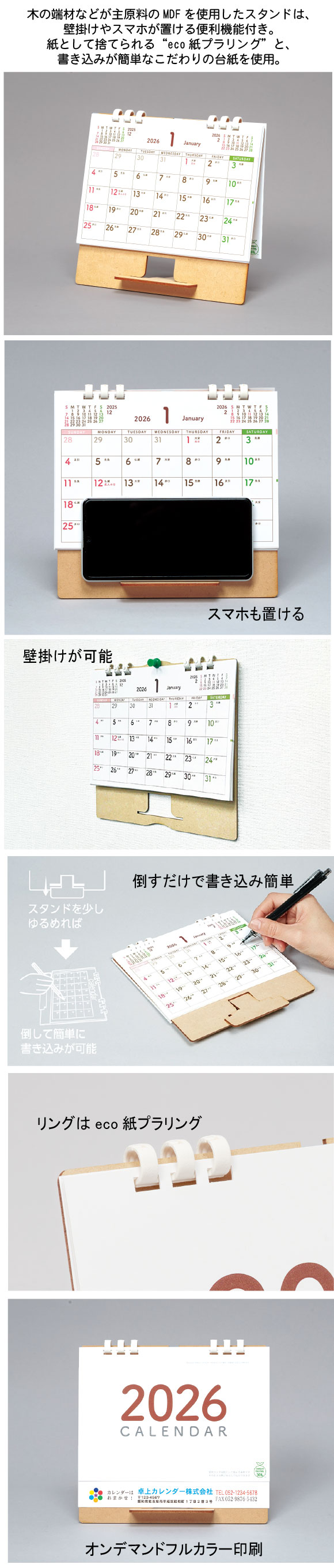 木質ボードエコカレンダーは木の端材などが主原料のMDFを使用したスタンドは、壁掛けやスマホが置ける便利機能付き。紙として捨てられる“eco紙プラリング”と、書き込みが簡単なこだわりの台紙を使用。名入れ白い名入れカードにフルカラーでオンデマンド印刷が可能です。1年中ご使用いただける卓上カレンダーはノベルティ、販促品として本体に企業やお店のロゴやマークなどの名入れをすれば より一層宣伝効果があります。