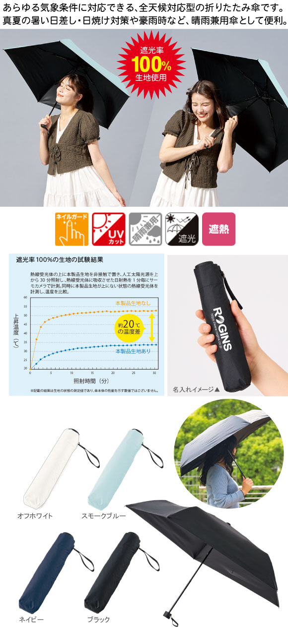 ベーシックオールウェザー折りたたみ傘は遮光率100%生地使用の折り畳み日傘であらゆる気象条件に対応できる、全天候対応型の折りたたみ傘です。真夏の暑い日差し・日焼け対策や豪雨時など、晴雨兼用傘として便利にお使いいただけます。遮熱効果があり、夏の熱い日差しから守ってくれます。傘袋はもちろん、本体傘パネル(別途見積り)、手元部分にも単色またはフルカラーで名入れができよりオリジナリティの高いアイテムを製作いただけます。