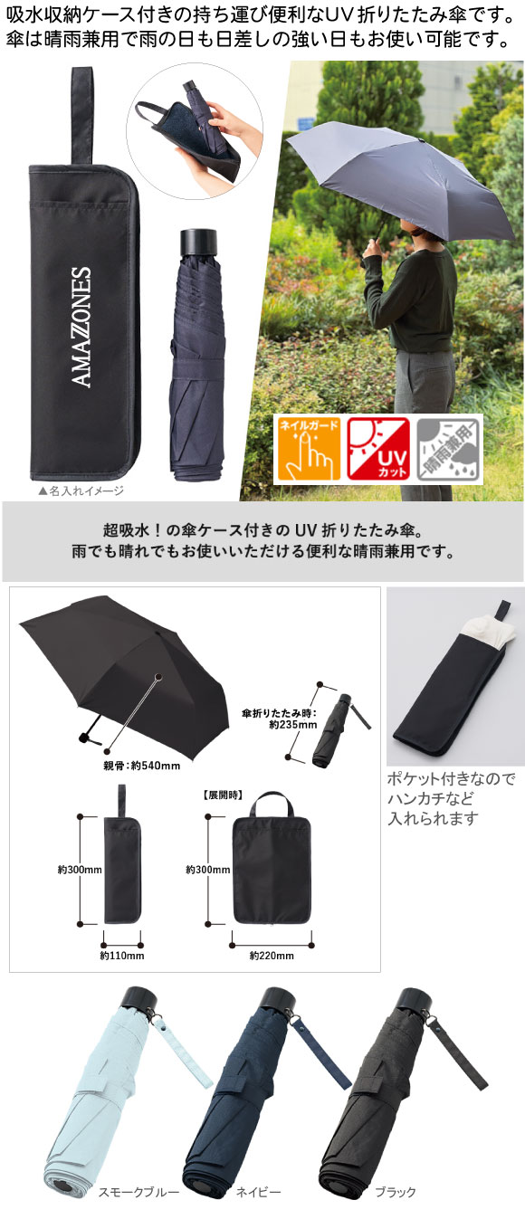 吸水収納ケース付UV折りたたみ傘は 吸水収納ケース付きのUV折りたたみ傘です。傘は晴雨兼用で雨の日も日差しの強い日もお使いいただけます。収納ケースは、外生地と内生地の間に不織布を噛ませたことで外に水滴が漏れることを防ぎ、マイクロファイバー×不織布でしっかりと吸水もしてくれます。外ポケット付きで、ファスナーを綴じずにそのまま収納が可能で便利な仕様です。また上部が半分ほど空いている仕様で、柄の長い折りたたみ傘なども収納でき、多種多様な形状に対応することができます。収納ケース、本体傘パネルに単色またはフルカラー印刷で名入れができ、収納ケースは名入れ範囲が大きめにとれるため、企業の記念品やアニメ・アーティストなどのエンタメ物販としてもおすすめです。