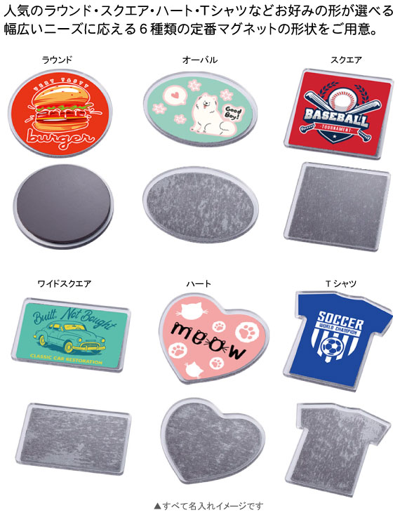 アクリルマグネットはお土産や記念品として人気のアクリルマグネットです。フルカラー印刷に対応したアクリル素材にマグネットを組み合わせることで、自由度の高い名入れが可能です。デザイン性・オリジナリティの高いアイテムをお作りいただけます。選べる形状は使いやすいラウンド、オーバル、スクエア、ワイドスクエア、ハート、Tシャツの全6タイプ。ファンアイテムとして映えるTシャツ型。ユニフォームやアーティスト関連グッズと相性抜群です。形違いを組み合わせたアソートでのご提案もおすすめです。