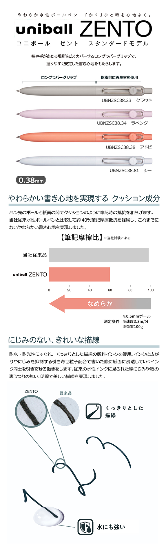 三菱鉛筆 ユニボール ゼント スタンダードモデル 0.38mmはストレスフリーなやわらかい書き心地と、にじみを抑えたきれいな描線が特長の新開発「ZENTOインクを搭載」。やわらかい書き心地を実現する『クッション成分 POA界面活性剤』(ポリオキシアルキレン)ペン先のボールと紙面の間でクッションのような緩衝作用を果たし、筆記時の摩擦抵抗※を和らげます。※当社従来品比 約40%減、インクの広がりやにじみを抑える『引き寄せ粒子』インク同士を引き寄せることで描線のにじみや裏うつりを抑えます。指や手があたる場所を広くカバーするロングラバーグリップで、握りやすく安定した書き心地をもたらします。軸の素材には再生材を使用しています。