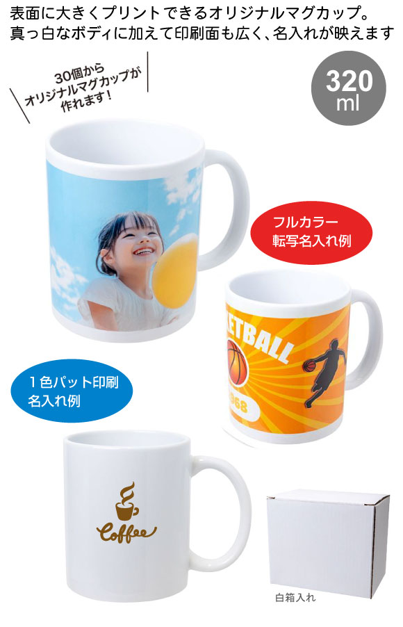 陶器マグカップ320ml は表面に大きくプリントできるマグカップ。広告面が大きいため写真やイラストも映え、PR効果は絶大です!オリジナルグッズや記念品にご利用ください。たっぷり入るサイズだから普段使いにも便利です。