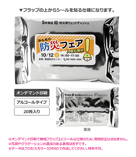 小ロット!5年保証防災用ウェットティッシュ(20枚)シール名入れ代込みは500個まで100個単位でオンデマンド印刷のフルカラー印刷が出来る安価な「5年保証」防災用アルコール除菌ウェットティッシュ20枚入り日本製。パッケージには防湿性の高いアルミ蒸着フィルムを使用しているので、製造から5年間の安定した品質保証をいたします。現在貼ってあるフラップ部分の上に1~4色のオリジナルシールを貼り、PRに効果的!安価で手軽な販促品としておすすめです。除菌ウェット商品としてノベルティ、販促品用に本体に企業やお店のロゴやマークなどの名入れをすれば より一層宣伝効果があります。