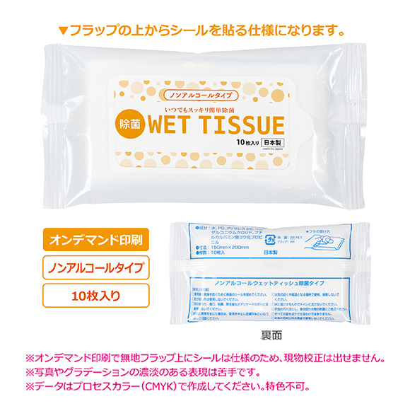 小ロット!ノンアルコールウェット(10枚)シール名入れ代込みは500個まで100個単位でオンデマンド印刷のフルカラー印刷が出来る安価な日本製ノンアルコール除菌ウェットティッシュ10枚入りです。現在貼ってあるフラップ部分の上に1~4色のオリジナルシールを貼り、PRに効果的!安価で手軽な販促品としておすすめです。除菌ウェット商品としてノベルティ、販促品用に本体に企業やお店のロゴやマークなどの名入れをすれば より一層宣伝効果があります。