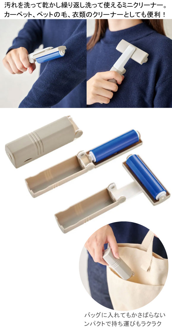 くりかえし洗えるミニクリーナーはカーペットについた髪の毛・ペットの毛・糸くずをとったり、衣類のクリーナーとしてとっも便利!コンパクトで持ち運びやすくどこでもサッと使用することができるので、お客様との打ち合わせや面接・面談の前などで身だしなみを整えるのにもピッタリです。粘着力がなくなってきたら汚れを洗って乾かすだけで繰り返し使えるので、紙をはがす手間やロールの交換の必要がなく経済的で環境にも優しいアイテムです。