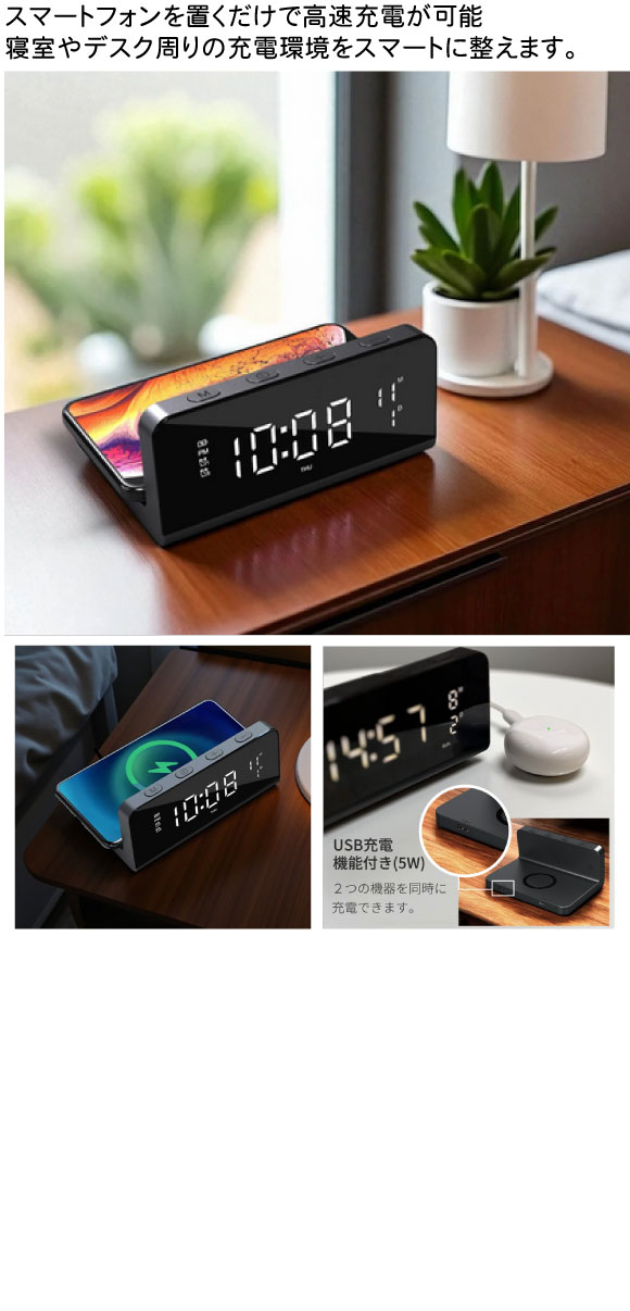 ワイヤレスチャージングクロックは最大15Wのワイヤレス充電機能を搭載した、多機能デジタルクロック。スマートフォンを置くだけで高速充電が可能で、寝室やデスク周りの充電環境をスマートに整えます。また、USBポートからは5W出力で2台目のデバイスも同時に充電可能。スマホとイヤホンなど、2台同時に給電できます。時刻表示は見やすいLEDディスプレイで、12時間/24時間表示の切替に対応。アラームは2つまで設定でき、スヌーズ機能も搭載。ライフスタイルに合わせて柔軟に使えます。さらに、表示をオフにできるナイトモードを備え、就寝中も眩しさを気にせず快適に。必要な機能をシンプルにまとめた、毎日の暮らしにちょうどいい1台です。1年中ご使用いただける時計は記念品はもちろんノベルティ、販促品として本体に企業やお店のロゴやマークなどの名入れをすれば より一層宣伝効果があります。