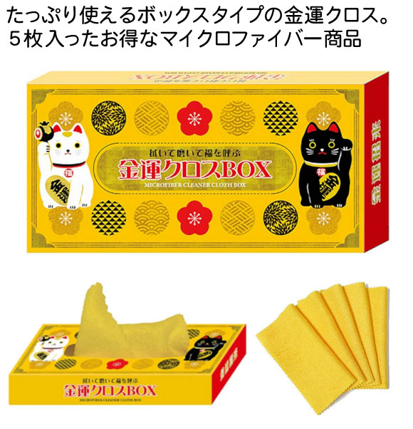 金運クロスボックス5枚入はかわいい招き猫のイラストで拭けば拭くほど福がやってくる黄金のマイクロファイバークロスです。運んでくるのは金運か開運?お正月や年賀、年始などの粗品に最適です。