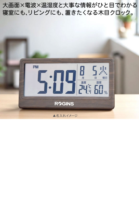 温湿度表示付き電波時計は大きく見やすい表示と温湿度管理ができる、木目調デザインの電波時計。あたたかみのあるウッドカラーがどんなお部屋にもなじみ、インテリアとしても優秀です。正確な時刻を受信する電波時計に加え、温度・湿度の表示機能を搭載。寝室でもリビングでも、置いておくだけで快適な空間づくりをサポートします。スヌーズ付きのアラーム機能で、目覚まし時計としても活躍。置き・掛け兼用で設置場所も選びません。